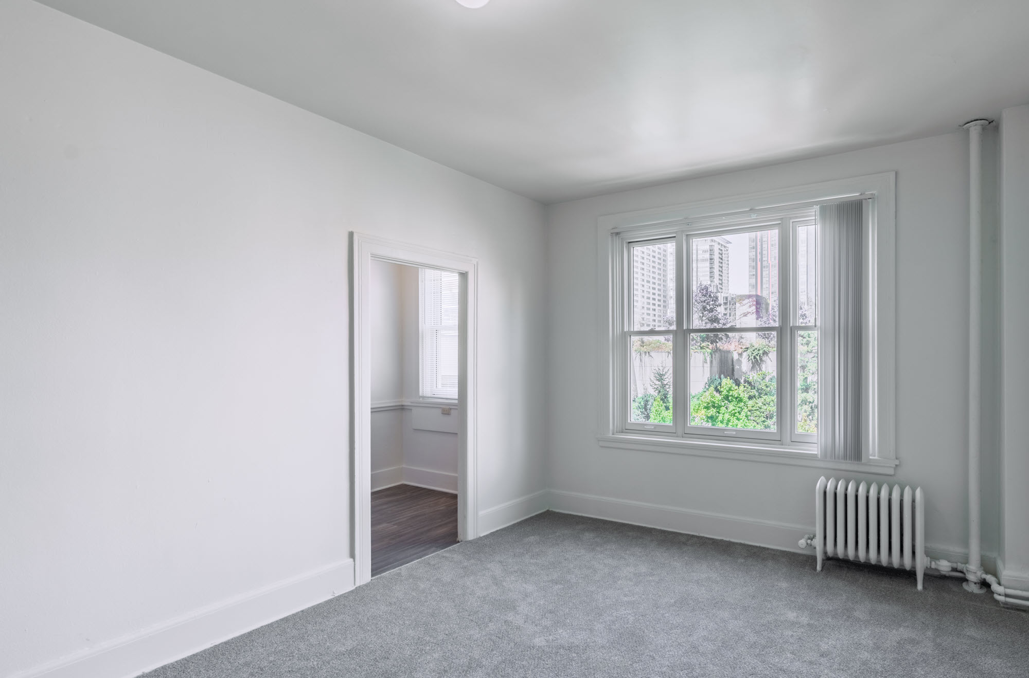 These First Hill studio apartments feature original architectural details, including vintage molding and built-in elements, along with large windows that deliver abundant natural light. Select homes offer city skyline views and views of Freeway Park, creating an inviting and character-rich living experience.
